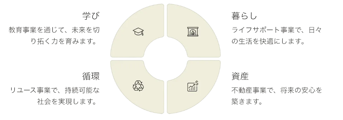 ・英会話サービス事業 ・不動産事業(売買・賃貸・仲介) ・ウォーターサーバー販売・取次事業 ・保険代理店業 ・古物商事業(リユース・買取販売) |